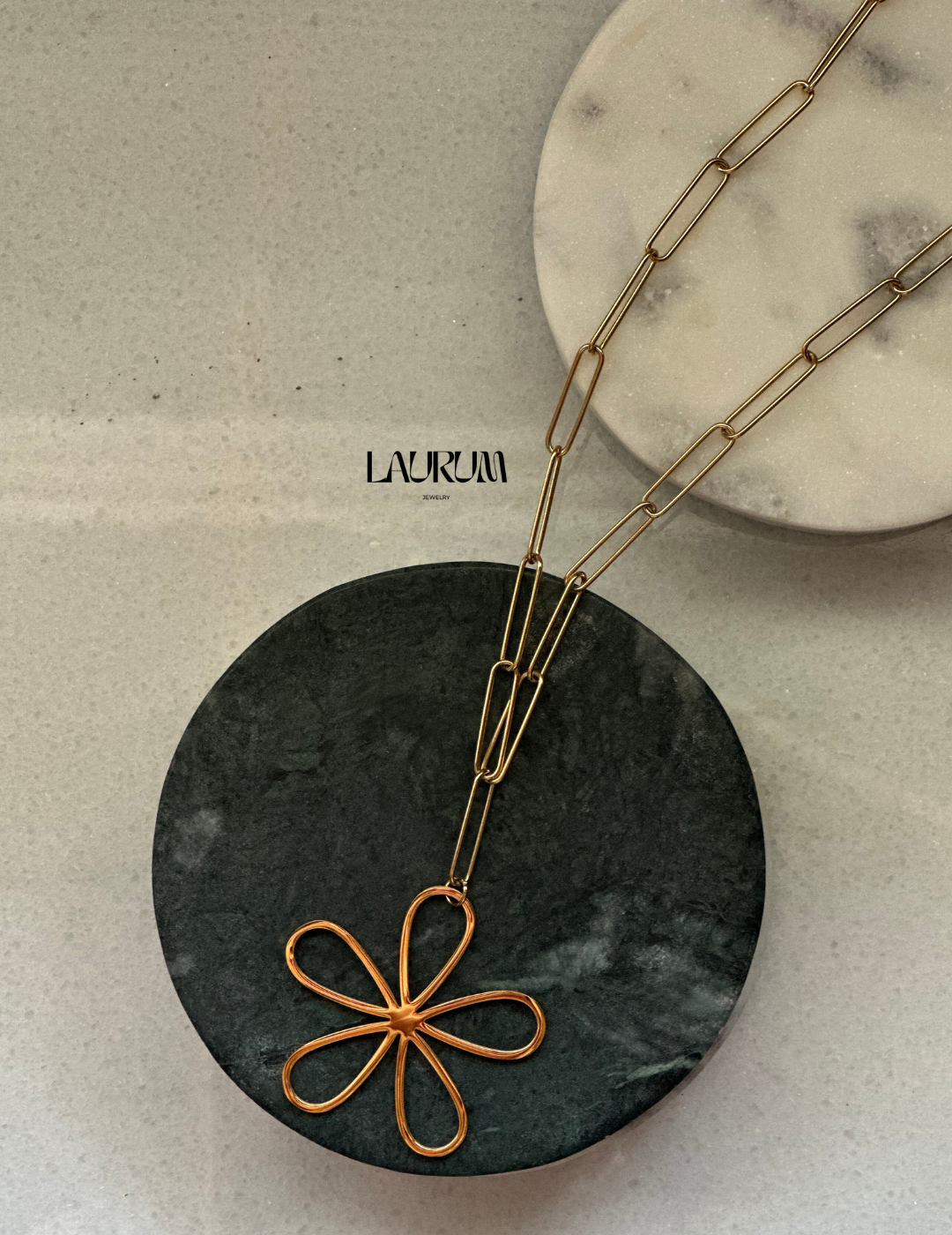 Collar de acero inoxidable con eslabones anchos y charm de flor.